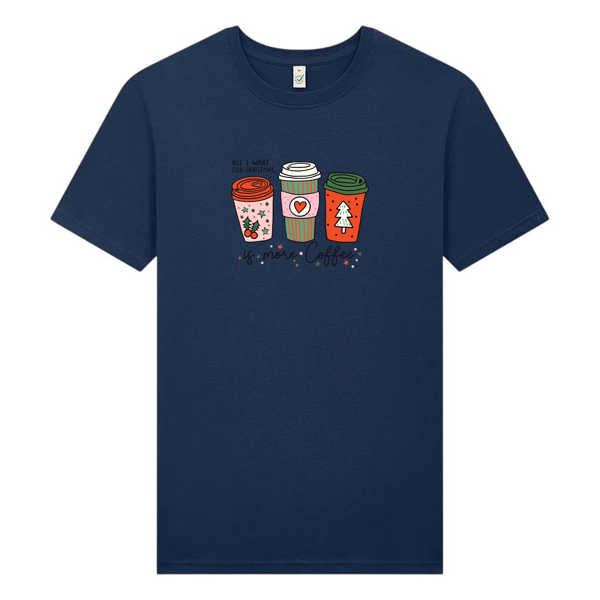 För kaffeälskare är All I Want For Christmas Is More Coffee T-shirt den perfekta jul t-shirten! Roligt och personligt tryck på en unisexmodell i ekologisk bomull.