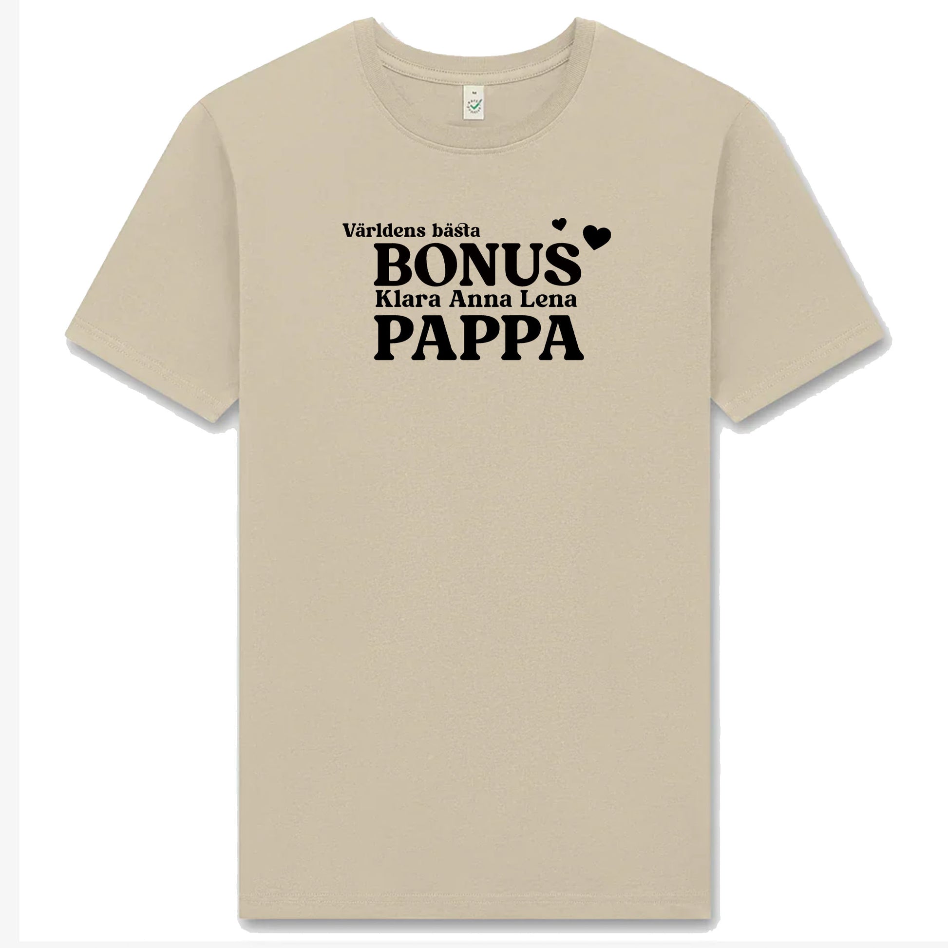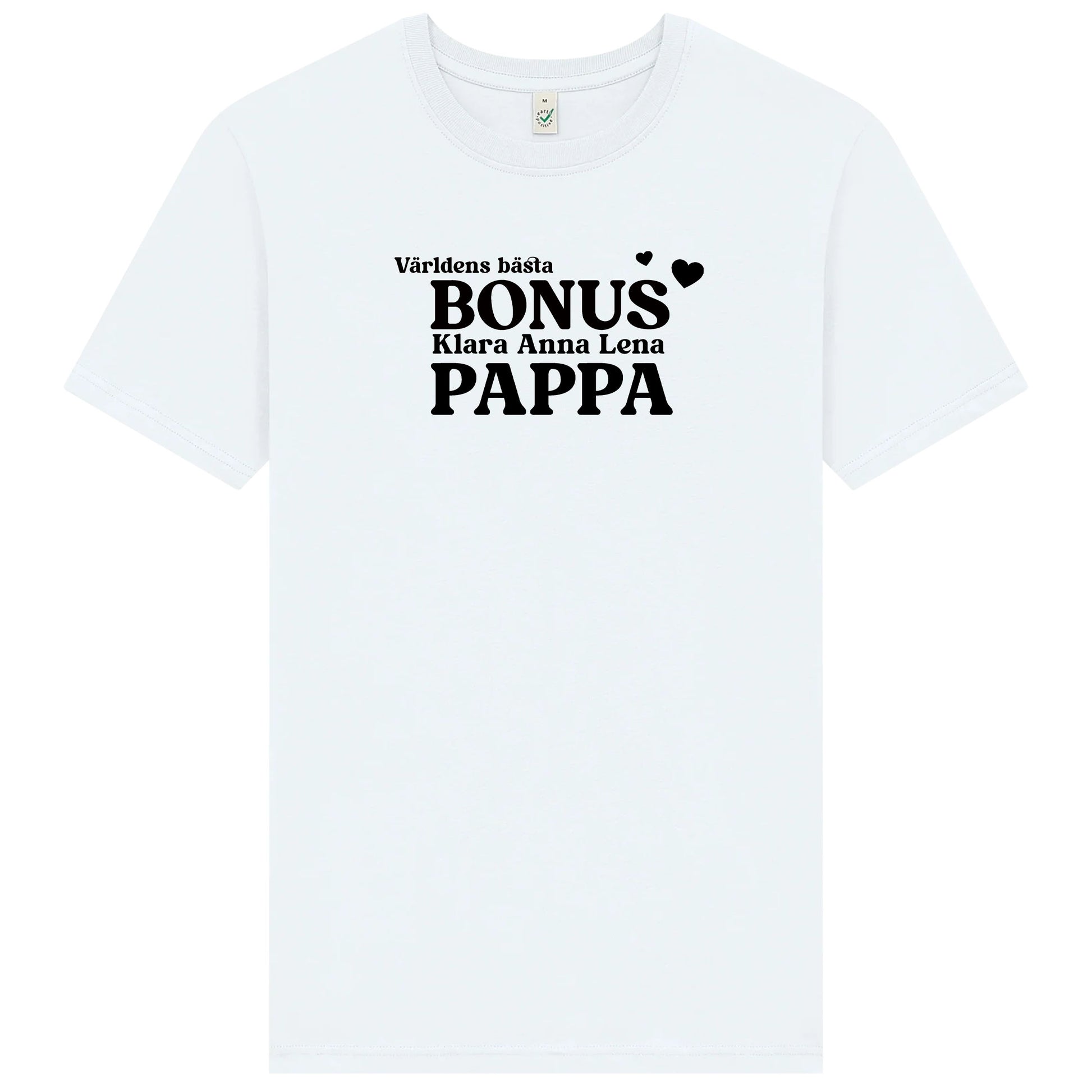 Den här personliga T-shirten med texten “Världens bästa bonuspappa” och barnens namn är en varm och uppskattad gåva till mannen som kliver in med hjärta, omtanke och humor.