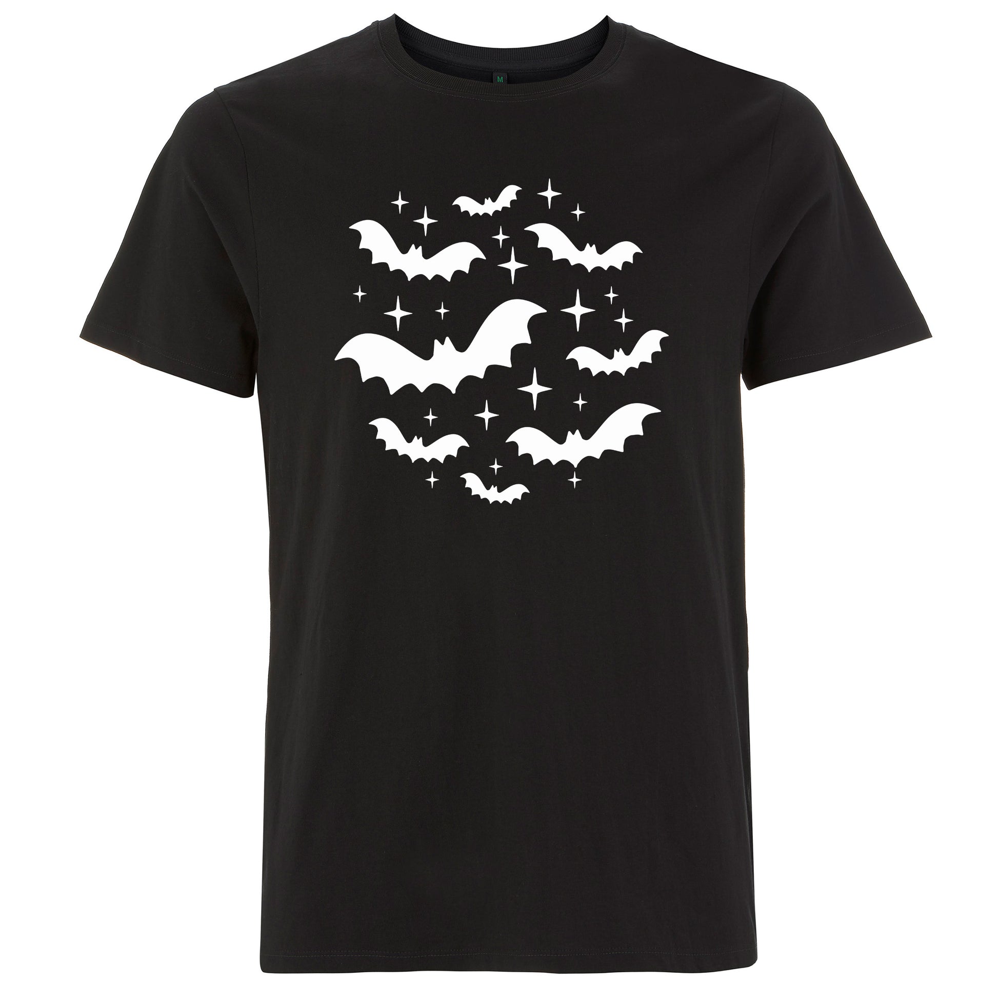 Visa din kärlek för Halloween med vår Fladdermöss Halloween T-shirt – en stilren unisexmodell i ekologisk bomull. Med sitt minimalistiska fladdermusmotiv passar den lika bra till vardags som till Halloweenfesten.