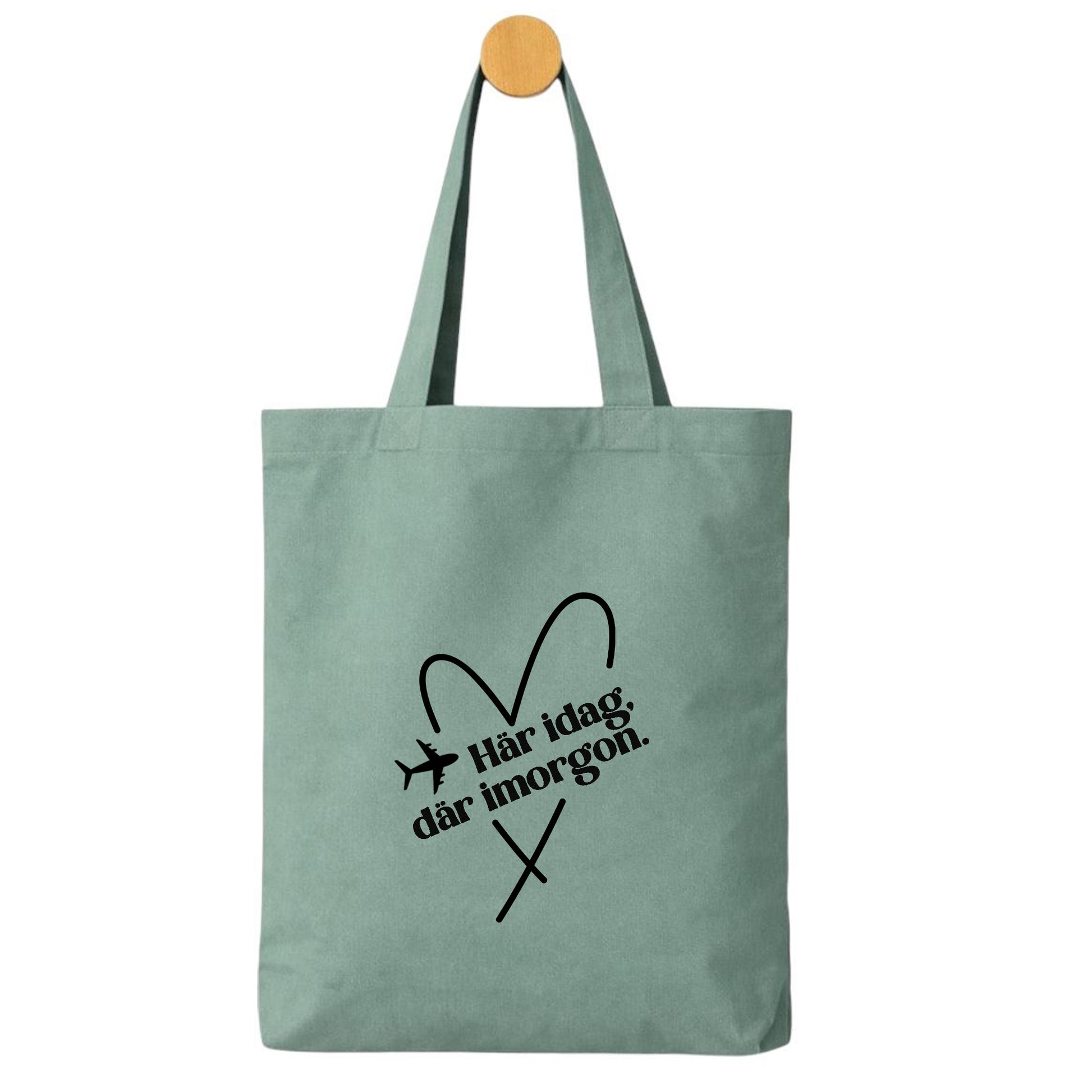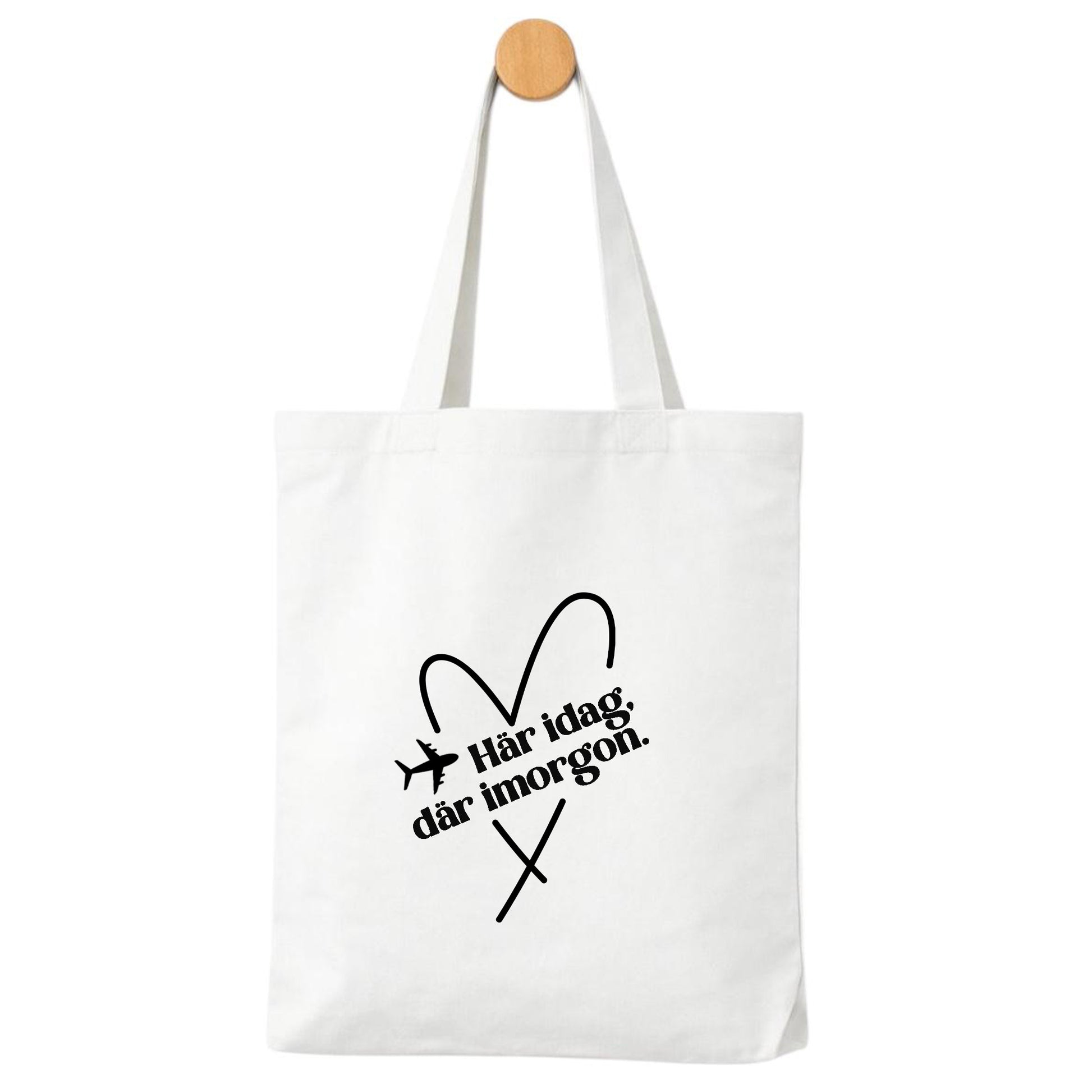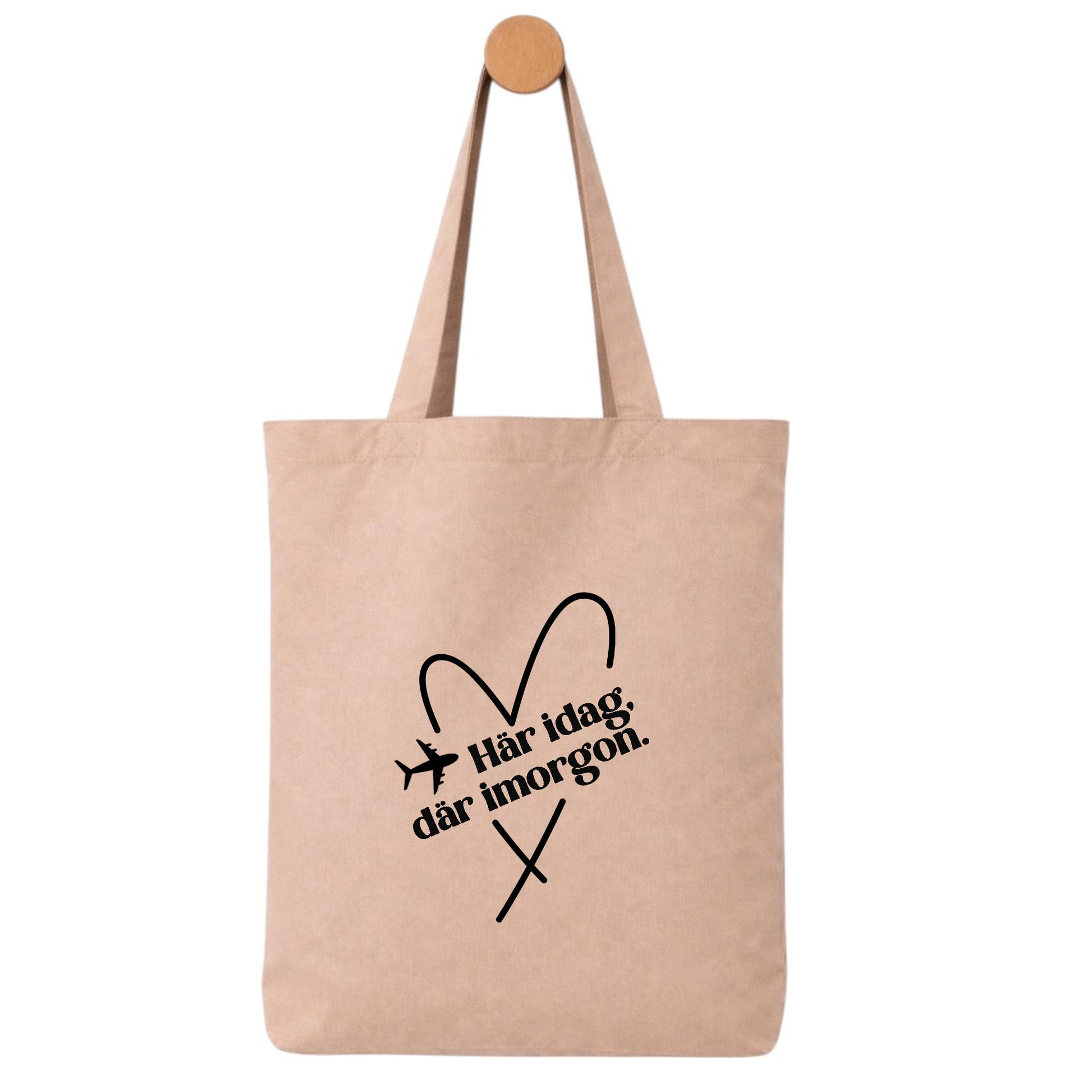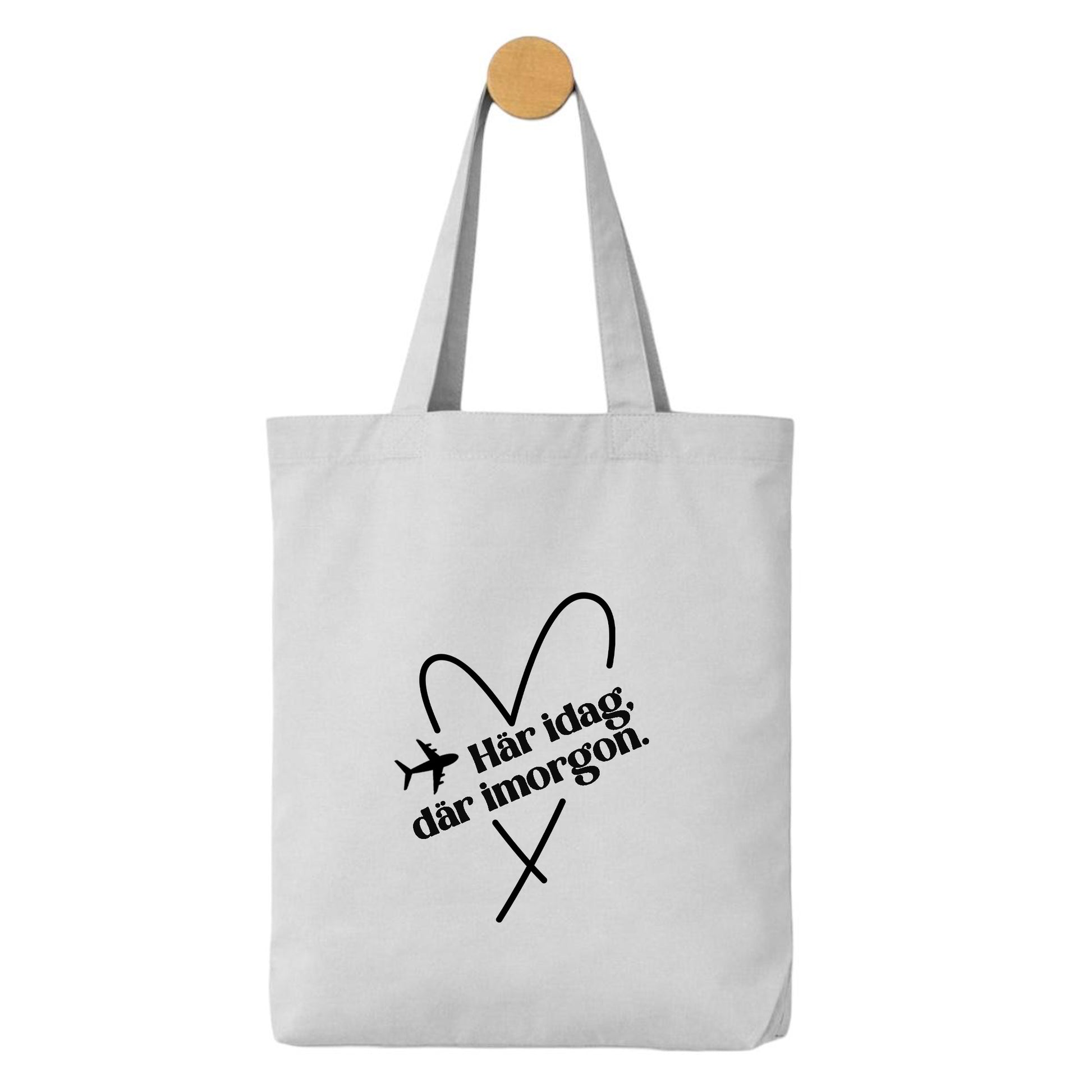 Denna tygpåse med texten ”Här idag, där imorgon” och flygmotiv fångar känslan av att alltid vara på väg – oavsett om det är en stor resa eller små utflykter i vardagen.