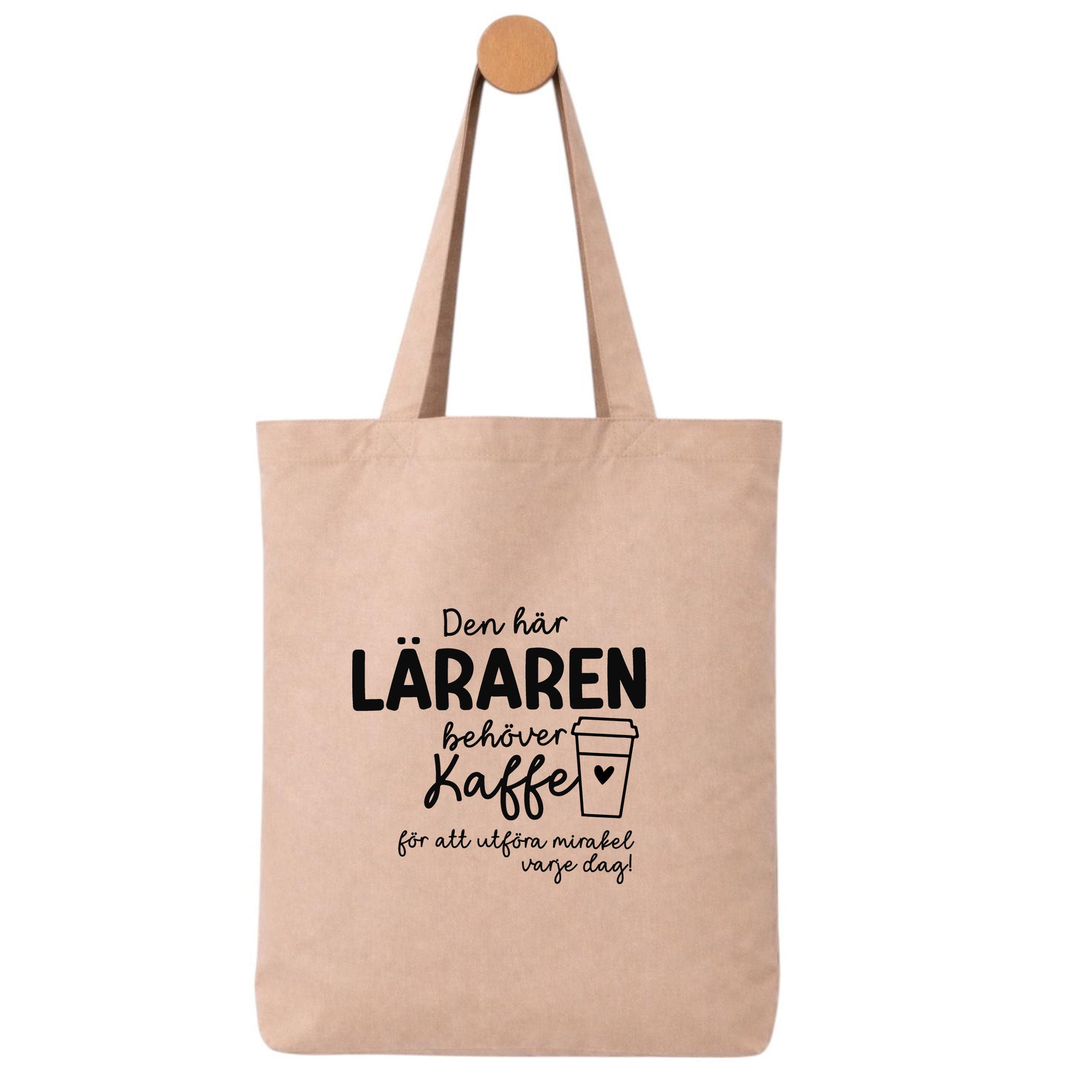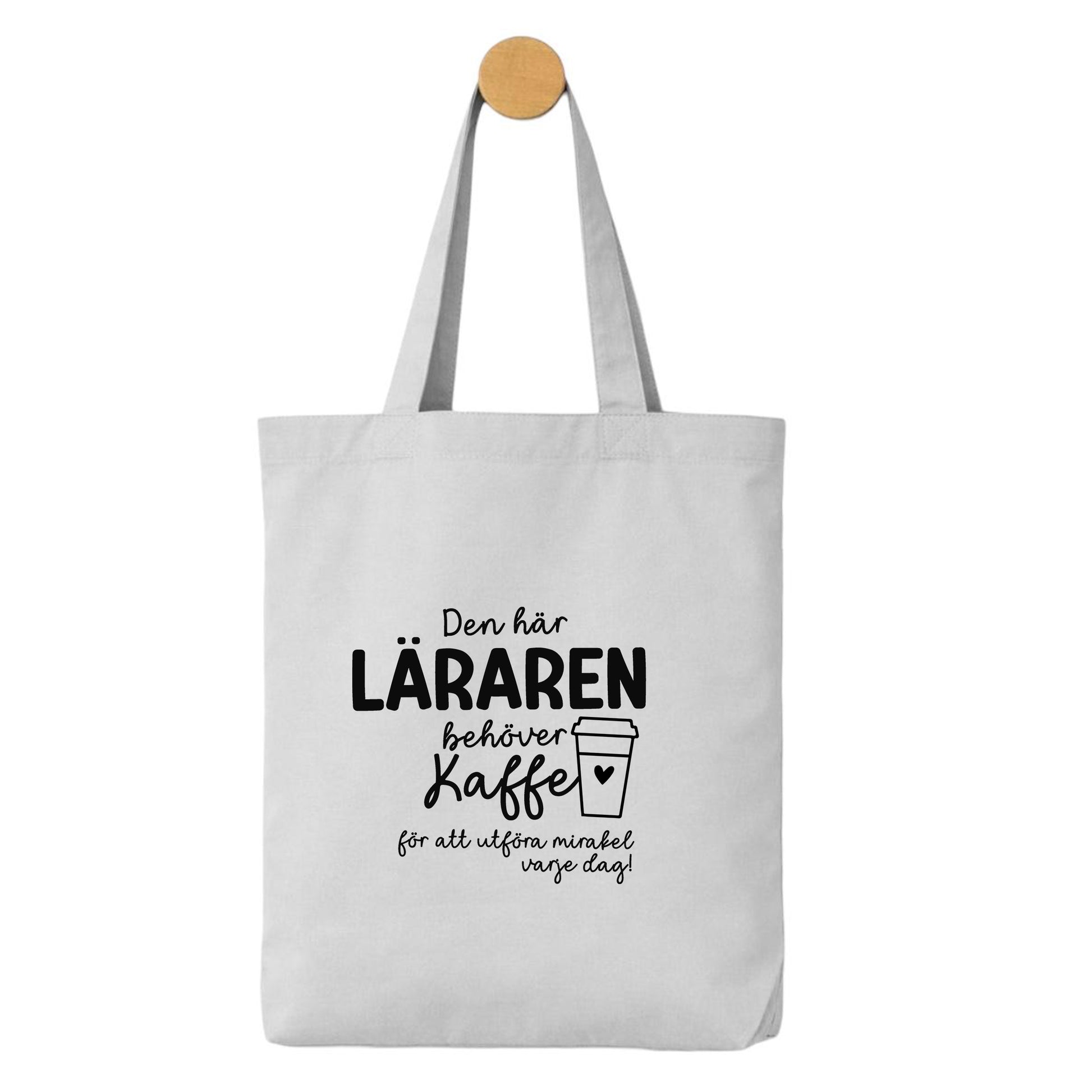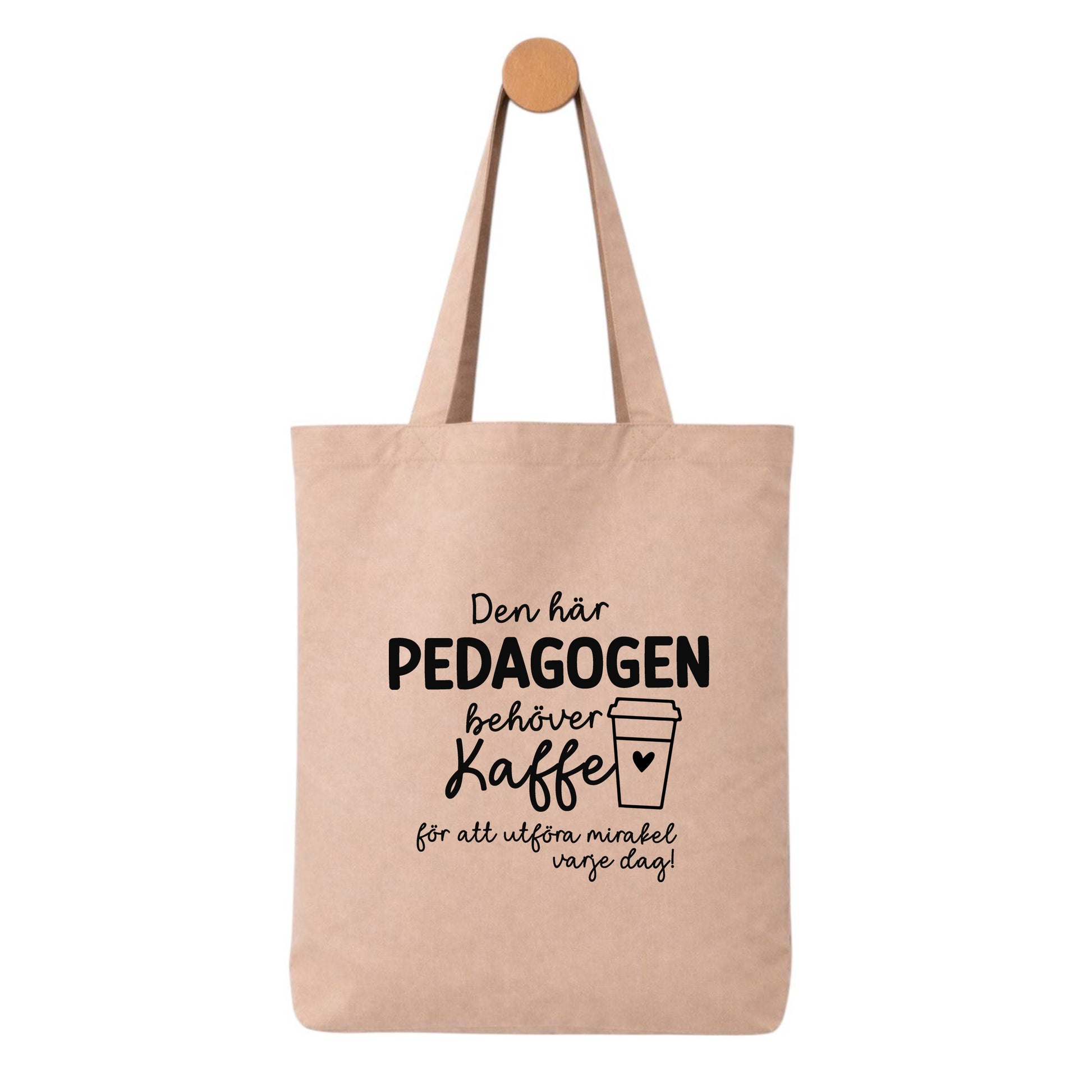 Denna tygpåse med texten ”Den här pedagogen / läraren behöver kaffe för att utföra mirakel varje dag!” är en perfekt kombination av igenkänning, värme och humor.