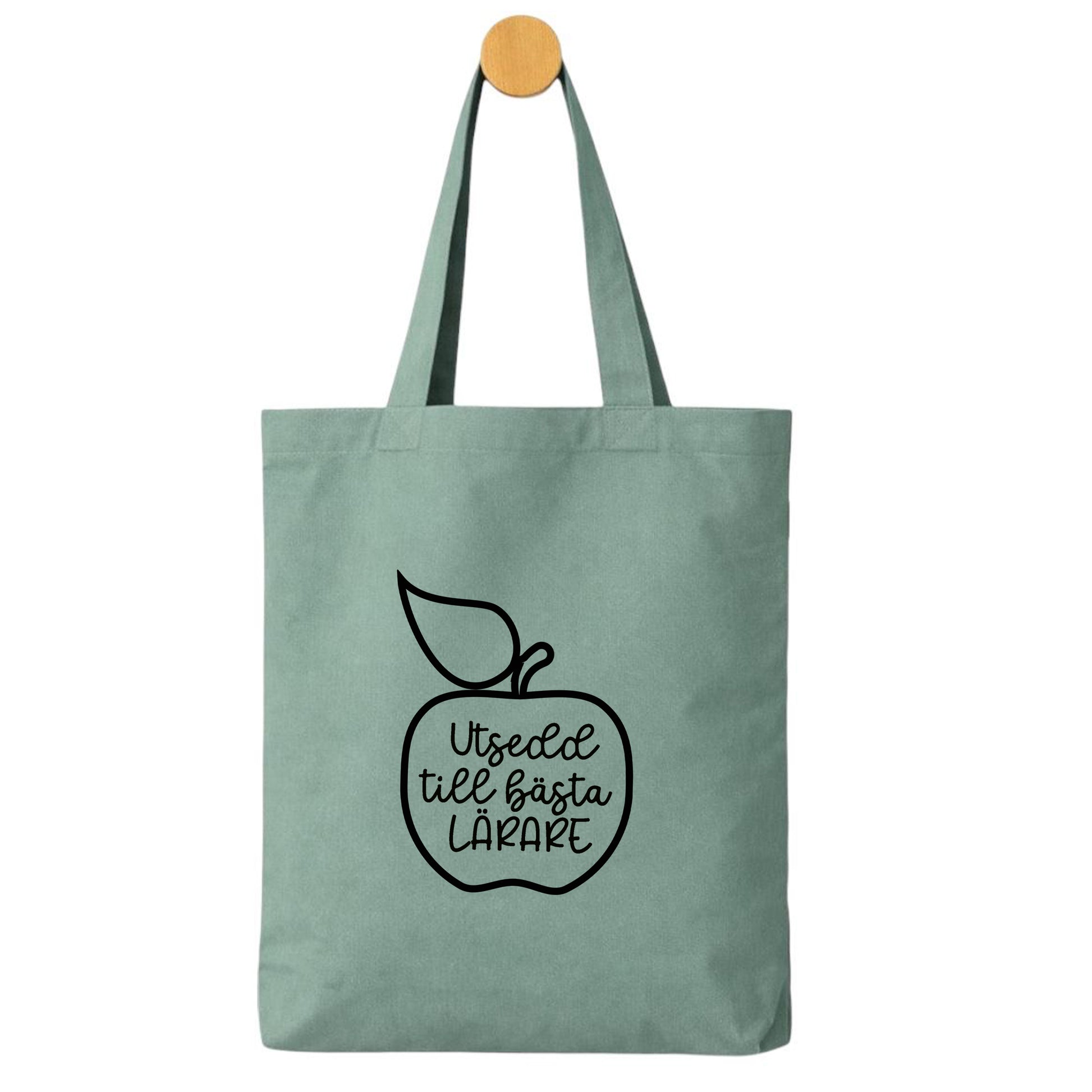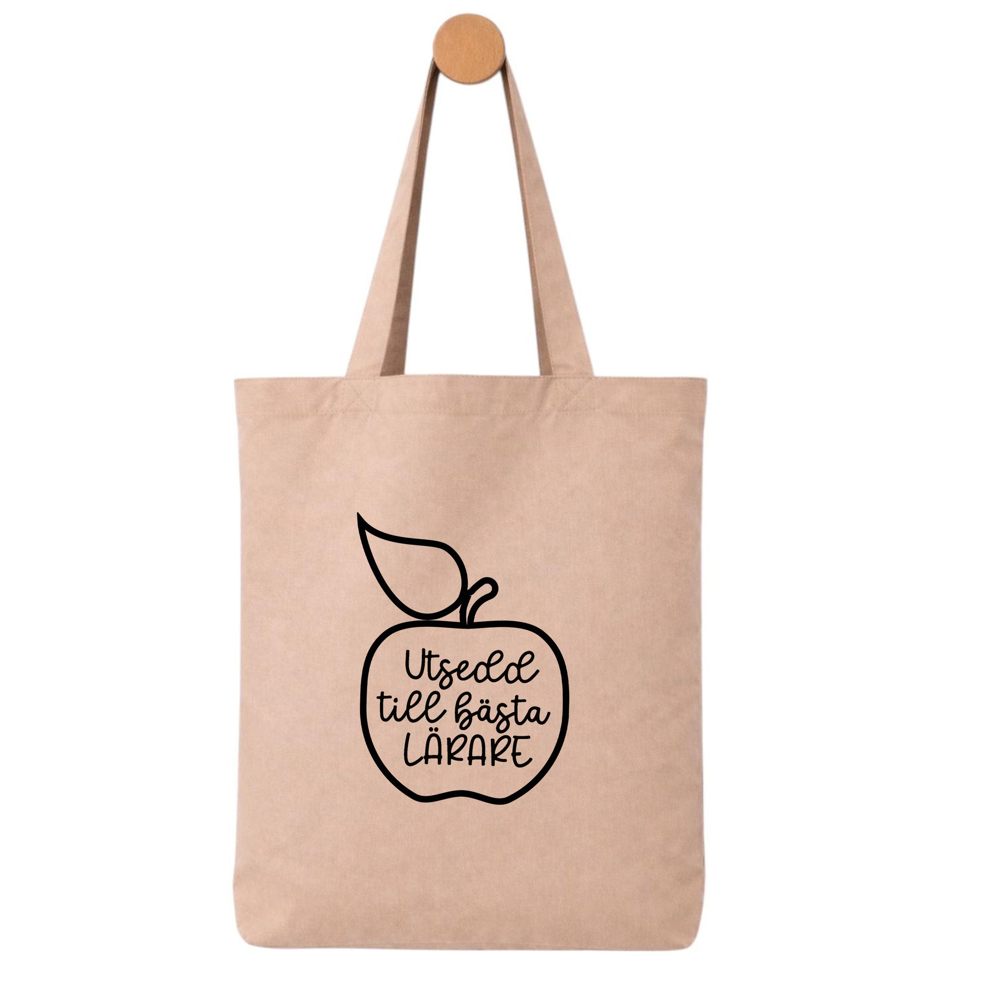 Denna tygpåse med trycket ”Utsedd till bästa lärare” är en perfekt gåva vid skolavslutning, terminsslut eller som tack från elev eller förälder.