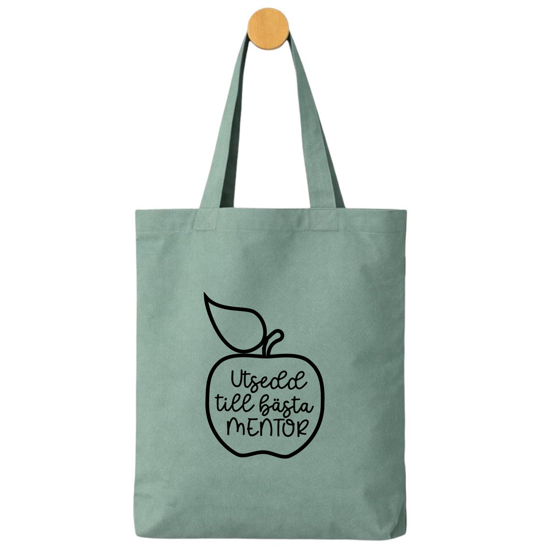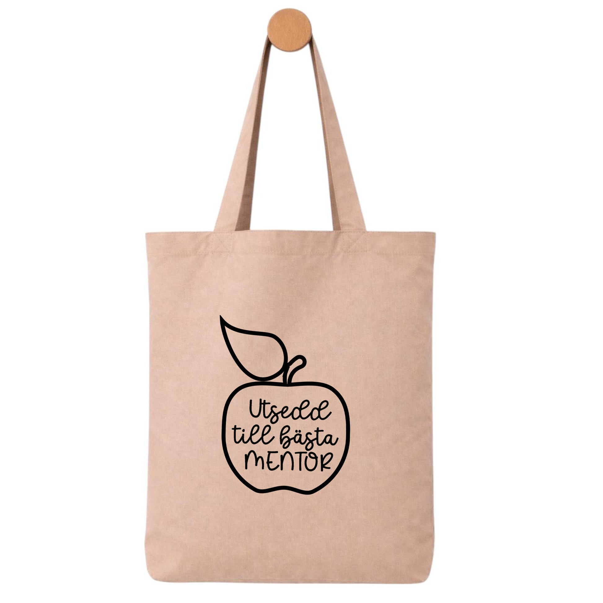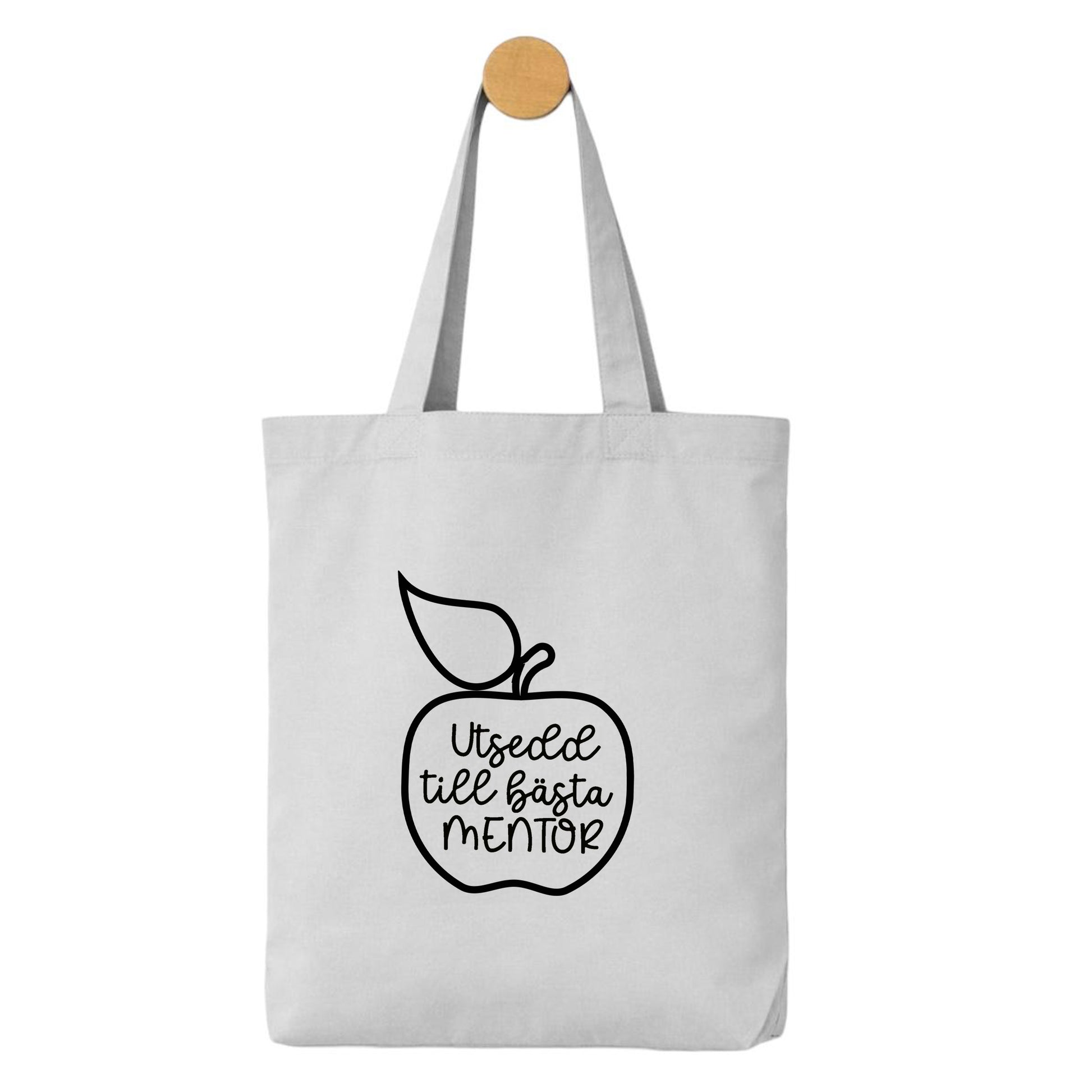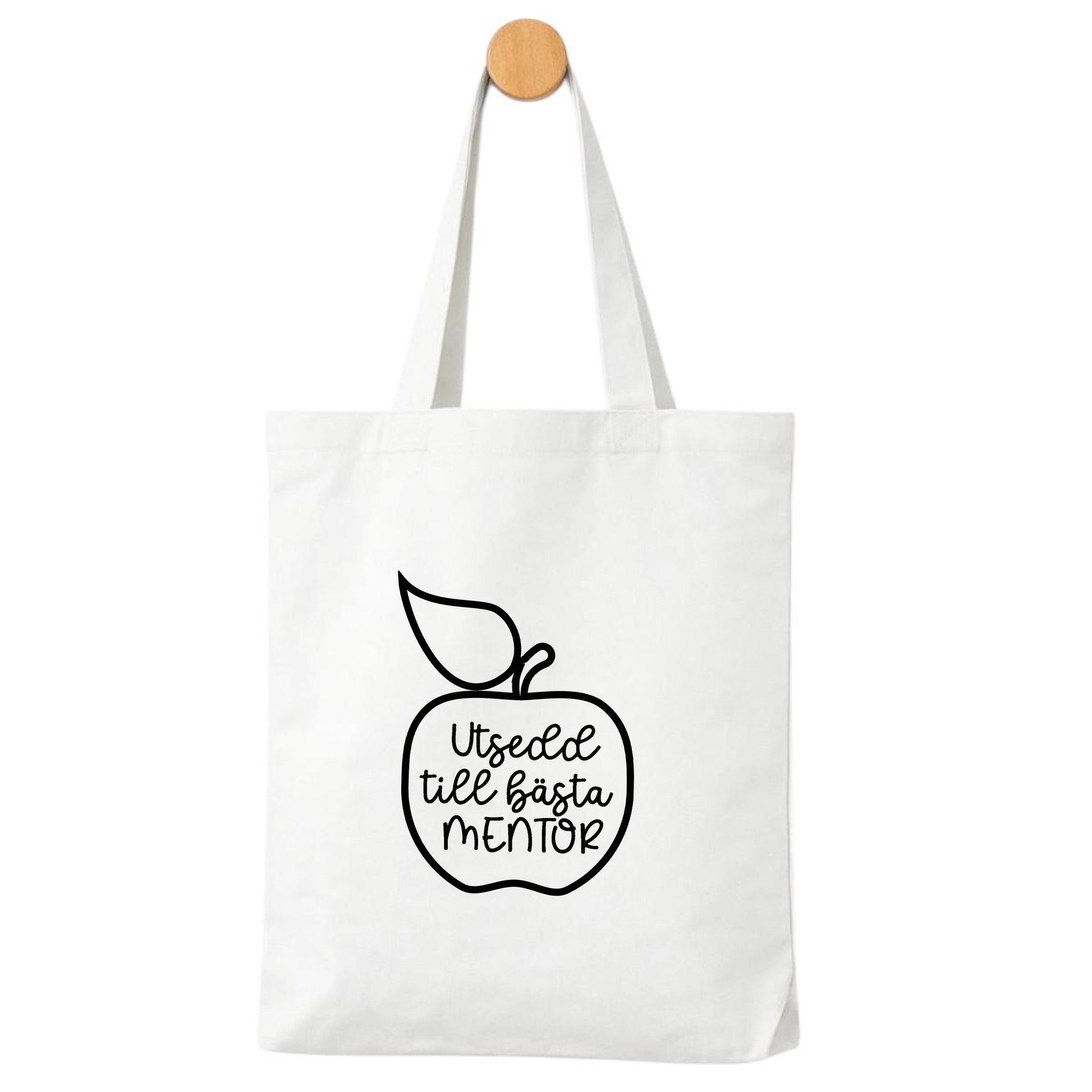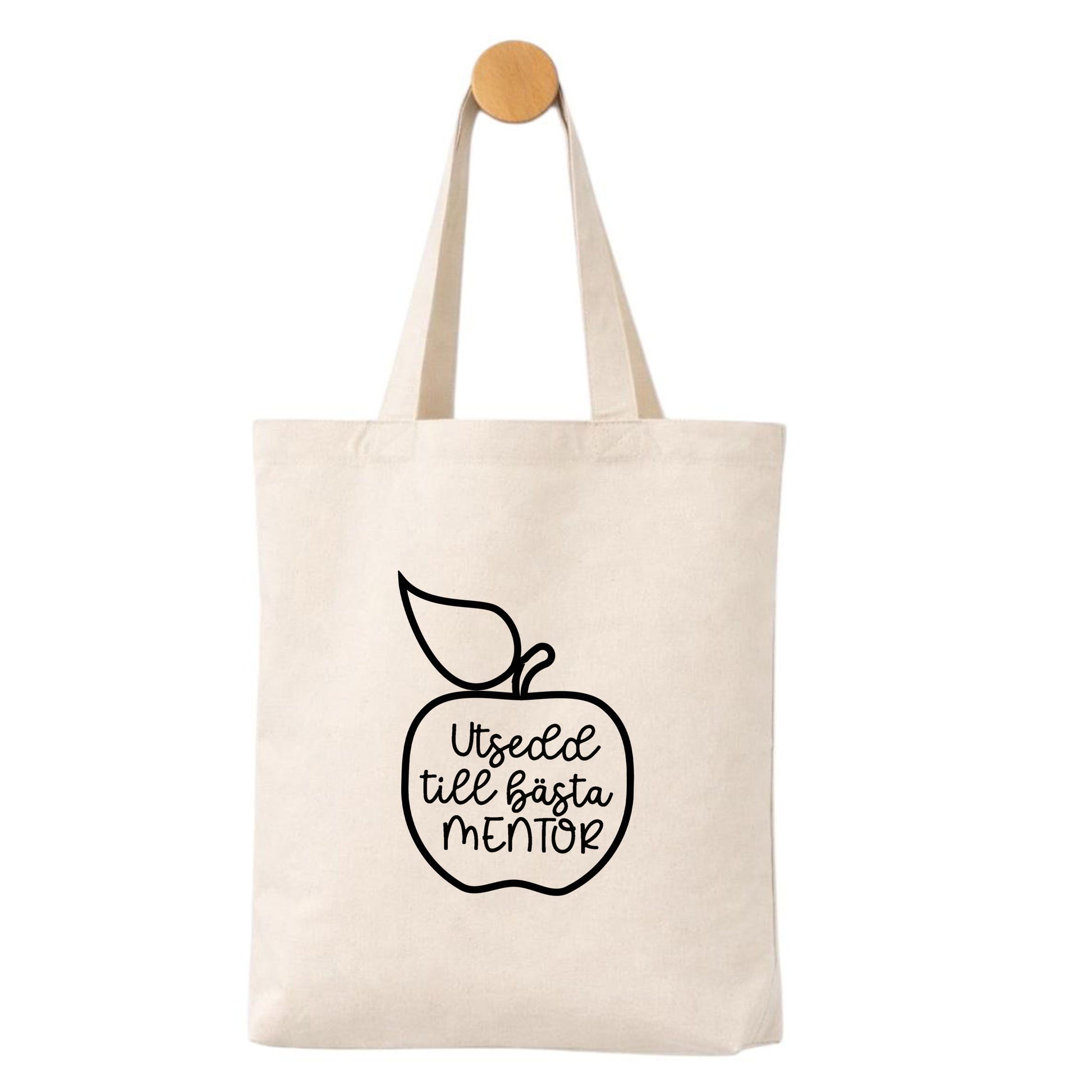 Motivet med äpple ger en klassisk och varm känsla – en present som passar lika bra till vardag som jobb. Tygpåsen finns även med text för mentor, så du kan enkelt välja rätt variant.